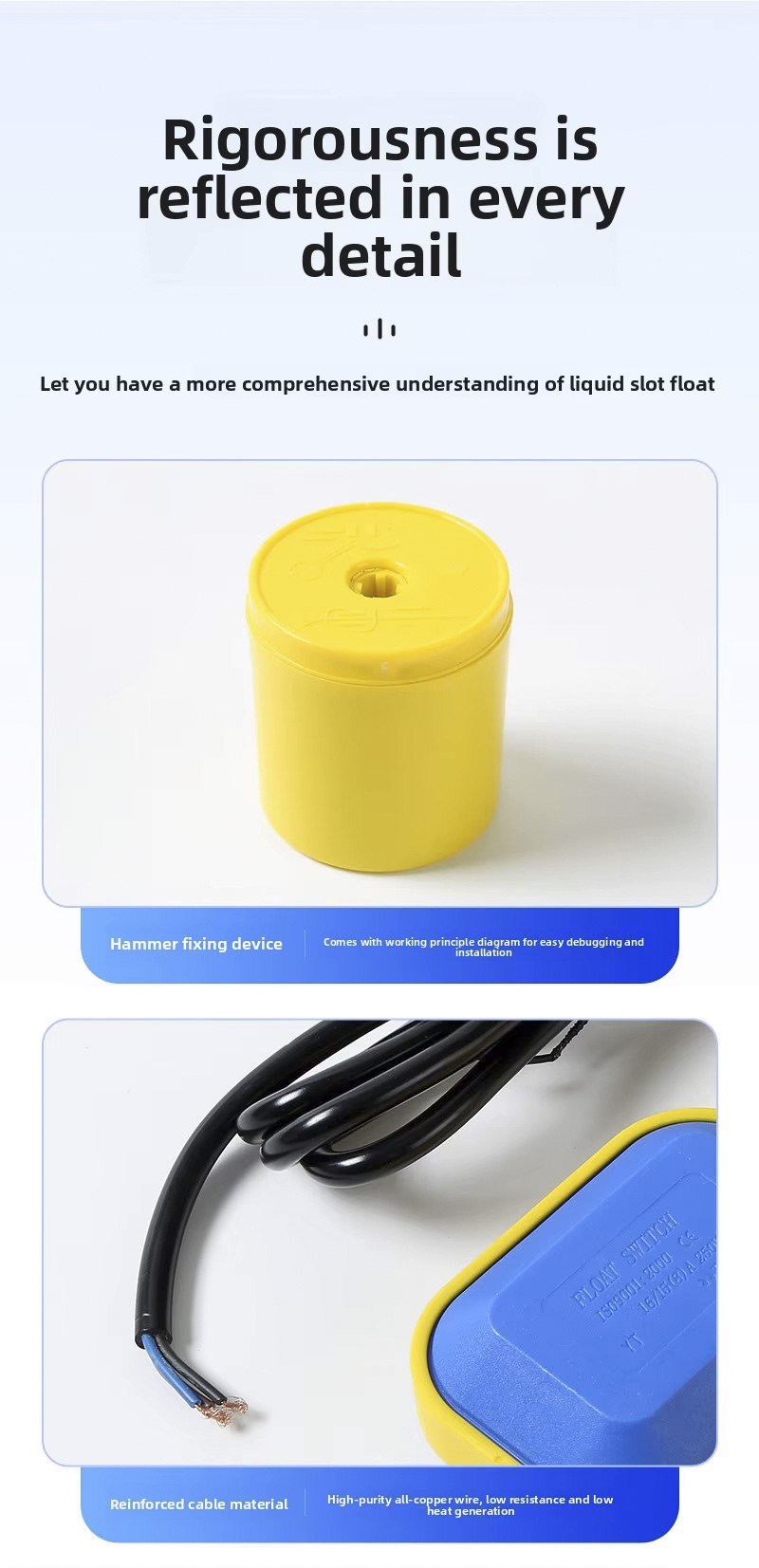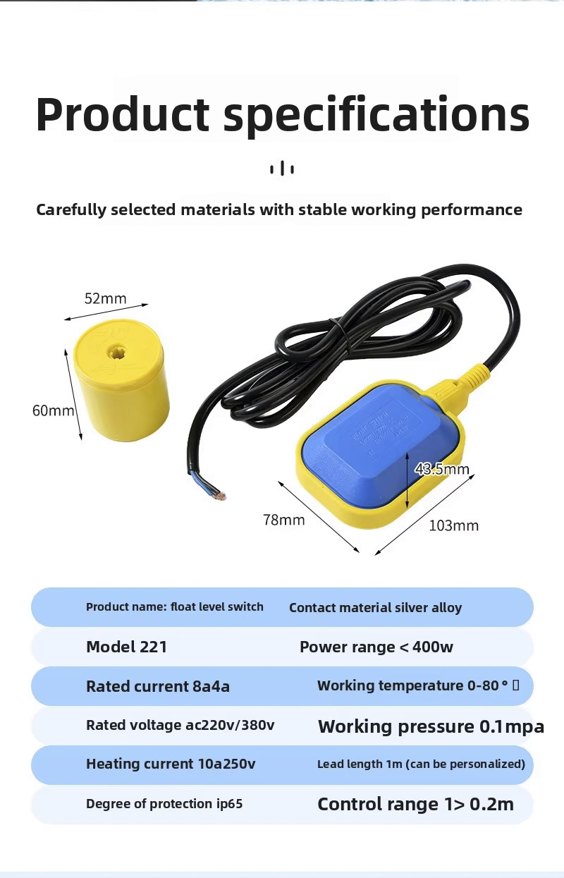 يتميز هذا المفتاح العائم بتصميم دائري كبير مع درجة حماية 2 م، 3 م، 5 م، 10 م، IP68، ويعمل في درجات حرارة من 0 درجة مئوية إلى 80 درجة مئوية، وهو يدعم نطاق جهد واسع من 110 فولت إلى 220 فولت ولديه ضغط عمل قوي يبلغ ± 0.5 ميجاباسكال. المنتج قابل للتخصيص من خلال النقش بالليزر أو الشعارات المنقوشة أو خدمات OEM/ODM، مما يضمن القدرة على التكيف مع التطبيقات المتنوعة.