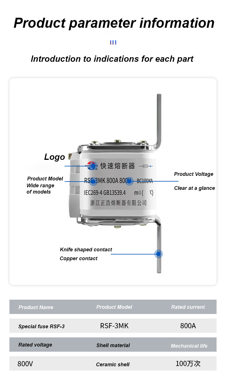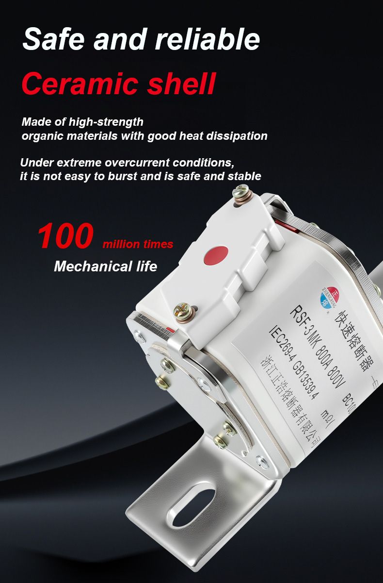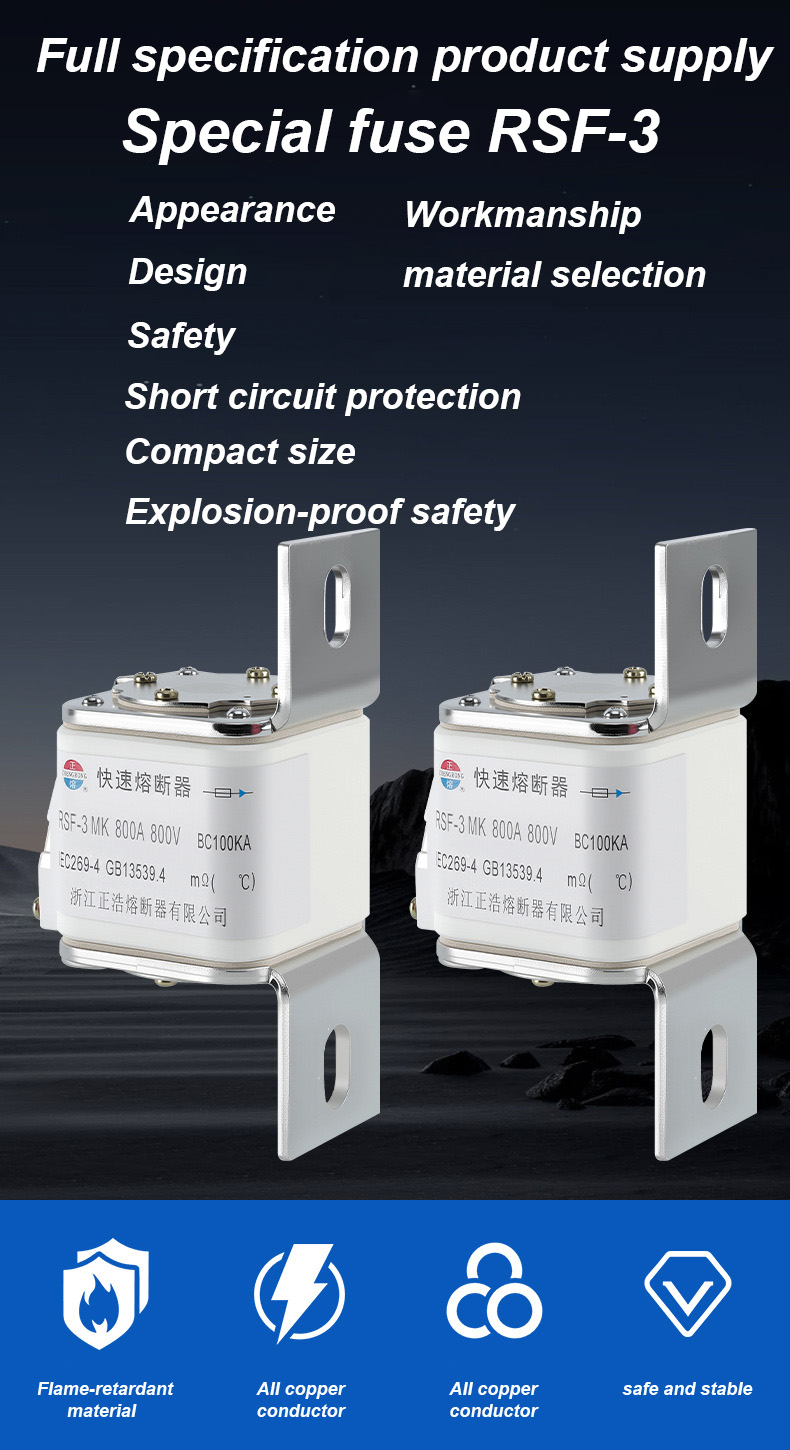 لديه جهد مقنن 500 فولت وتيار مقنن 315 أمبير، والذي يمكن أن يضمن السلامة الكهربائية بشكل فعال، ويمنع التحميل الزائد والدوائر القصيرة. وصلات الصمامات RSF-3MK 800V-800A BC100KA